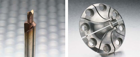 ▲製造に必要な工具さえ自社で内製する。ラジアルエンドミル(左)とチャック(右)。