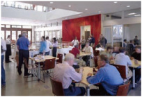 ▲名門スタンフォード大学の研究室から会議室、食堂など863台のテーブルで採用された「テーブル昇降脚」。シリコンバレーにある大学らしくスタイリッシュなデザインと機能が評価された。