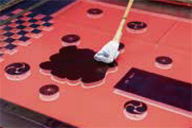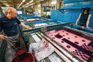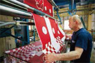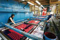 太泉晒染工業株式会社の工場に入ると、何十メートルもあるフラットスクリーン捺染(なっせん)機がどんと据えられていました。1日に5千枚のスクリーンプリントを行う能力があるとか。こうした染めの機械化を国内でいち早く導入したのが、中川清一現取締役会長です。