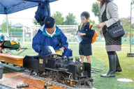 約12㎝幅の線路の上を実際に走るミニ蒸気機関車。実物の約8分の1というサイズですが、動力は本物と同じく、石炭を燃料におこした蒸気です。煙を出して走る姿に子どもたちだけでなく、大人も目を輝かせて客車に乗る姿が、イベント開催の一日中、絶えることがないとか。運転士は、株式会社ダイキファインの喜代田洋志社長です。「もともと子どもの頃から鉄道が好きで模型を収集していましたが、鉄道模型の展示会でライブスチームと呼ばれる小型乗用模型蒸気機関車を見て、力強く走る姿はもちろん、大きな汽笛の音や金属のきしむ音など、五感を刺激するミニSLにとても惹かれました。そして、これだ!と思ったんです」。