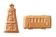 ▲堺の和菓子店が共同で開発した「堺燈台もなか」や、「ちんちん電車もなか」など、堺市ゆかりの最中菓子の種も多く作っている。