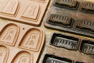 ▲帆立貝などの定番のデザインの型は自前で持っているが、和菓子店それぞれの意匠の最中は、型を預かって焼いている。
