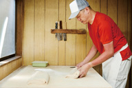 ▲もち粉をついてのばしたものを丁寧に折りたたみ、短冊型に切り分けていく作業も、昔から変わらず全て手作業で行っている。