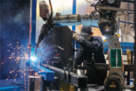 ▲溶接ロボットを操作する若手技術者