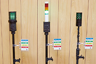 ▲「CO2センシングポール®」は、積層点灯型とフルカラー型の2種。近々、新デザイン(写真右)も発売予定。