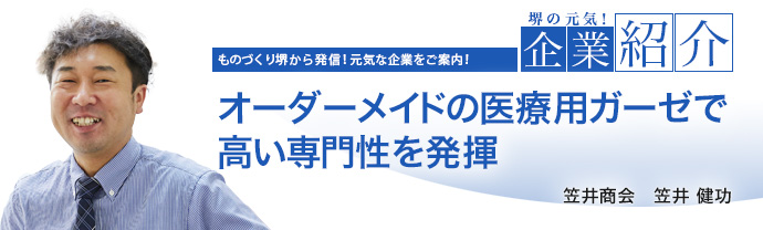 当社ではまず、無蛍光のガーゼを取り寄せ、一般のガーゼハンカチをまだ製造していた頃には、医療用ガーゼを縫製する前にミシンまわりをきれいに清掃するなどの配慮をしていました。やがて非常に特殊な製品である医療用ガーゼの製造販売に専念することにしたのです」と笠井健功氏は語っています。