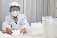 当社ではまず、無蛍光のガーゼを取り寄せ、一般のガーゼハンカチをまだ製造していた頃には、医療用ガーゼを縫製する前にミシンまわりをきれいに清掃するなどの配慮をしていました。やがて非常に特殊な製品である医療用ガーゼの製造販売に専念することにしたのです」と笠井健功氏は語っています。