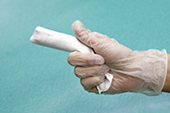 「研究会の中で個別相談会が開かれた時、嚥下(えんげ)障害を持つ患者さんの口腔内を清掃するための製品が作れないかという相談を受けました。これまで裁断されただけのカットガーゼを指にぐるぐる巻きつけて使っていたそうで、その手間を軽減したいという要望でした。単価を少しでも低く抑えるため最初は三角に折って縫ったものを試作品として持っていきましたが、ケアの途中で抜けないように握り込むための柄が必要なことや、その柄が長すぎても短くてもいけないこと、さらには指を全て覆うものでなければいけないことなどをクリアさせるためにいくつもの試作を重ねました。現在は完成し現場でモニター使用中です。家庭の介護現場でも需要が見込める製品で、今年の発売を目指しています」。