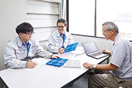 ▲新規事業の製品について、より良いモノづくりのため社内ミーティングで常に情報共有をしている。