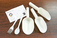 ▲トウモロコシのデンプンや乳酸菌などから作られる生分解性バイオマスプラスチック(ポリ乳酸)製品。